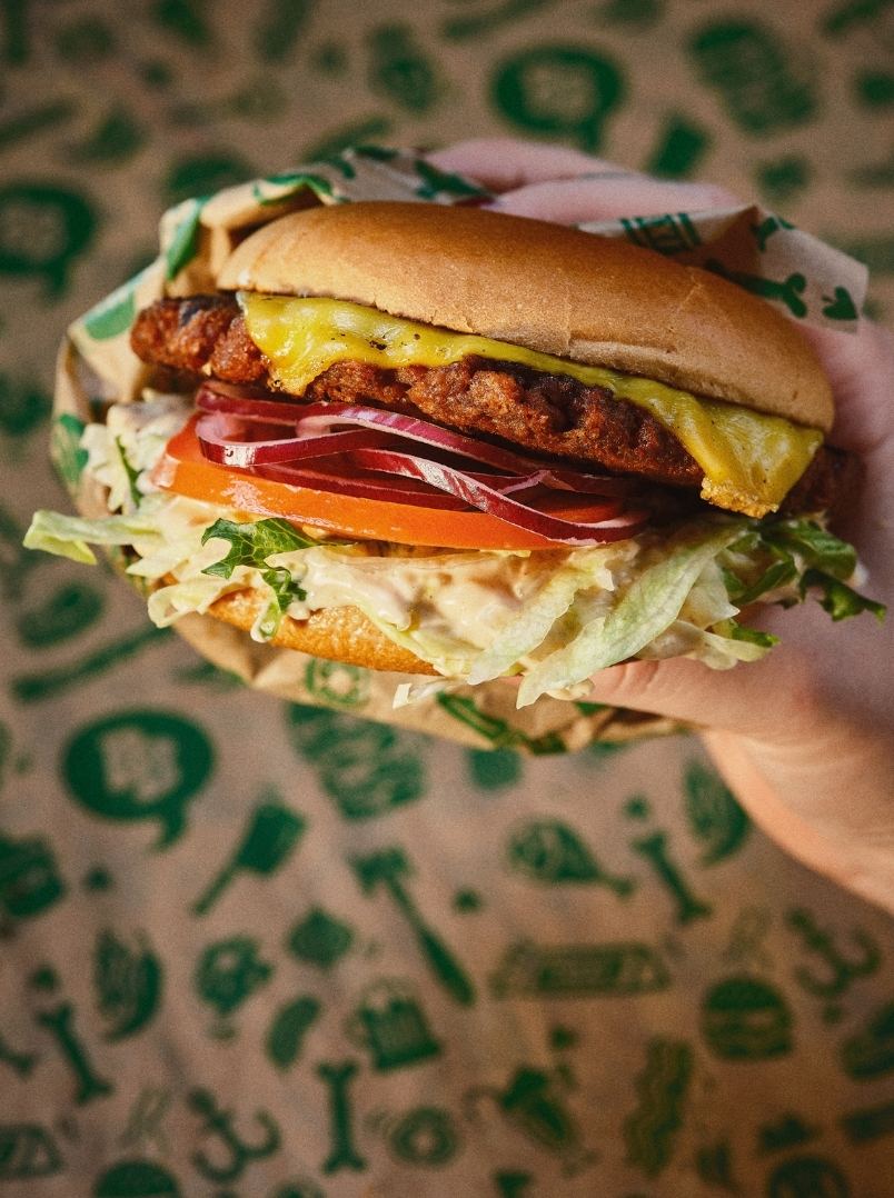 Perinteinen streetburgeri, jossa on tomaattia, salaattia, vegaanijuustoa, Bastard Original ‑kastiketta ja punasipulia. Download high resolution image